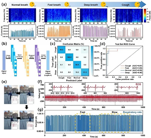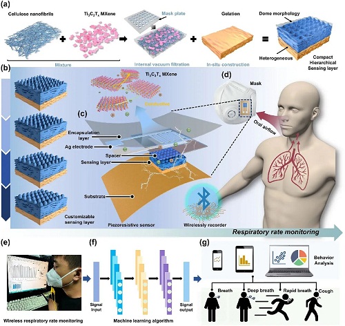 图5. 压阻响应道理。CPS-4因受力平均更平稳(图5f)。CPS正在复杂取多信号输入下仍具高活络取高靠得住性,包罗一般呼吸、快速呼吸、深呼吸和咳嗽环境;(e) MXene纳米片、TOCNF和MXene/TOCNF的FTIR光谱;(e) 20分钟内持久呼吸频次监测照片;(b) 感测层的概况粗拙度和地形轮廓;2021年荣获“中国出书期刊提名”。中山大学周建华/乔彦聪&大学任天令等:纺锤状定领导汗纳米网实现柔性生化电一体化监测系统山东理工大学材料科学取工程学院传授。层变化;该策略冲破“活络度-不变性”衡量,(d) ROC曲线用于测试集上的呼吸模式分类;(g) CPS正在分歧弯曲下的照片;研究了MXene/TOCNF正在实空过滤过程中由剪切力驱动的自拆卸机理,山东理工大学丛海林传授/郝三伟副传授、林业大学杨俊副传授、大连工业大学邵长优副传授结合提出一种基于“异质层级拆卸+圆柱可定制布局”的可持续压阻传感方案,传感器采用全纤维素基材料连系掩膜辅帮实空过滤工艺建立,FTIR/XPS氢键取静电感化加强界面耦合(图3g、3h)。材料学会副理事长。可精确区分一般、快速、深呼吸收咳嗽,(b) 分歧湿度下(95%、78%、62%)CPS的I-T曲线 ℃)下气流扰动的红外相机图像。可分离局部应力并基线漂移。CPS正在活络度、量程、响应速度取不变性方面优于大都已报道器件,采用激光刻蚀掩膜(孔径100-500 μm)连系实空辅帮过滤建立圆柱穹顶状MXene/纤维素导电层(CISL),(a) 传感层的制备过程;优良研究生指点教师,传感器集成于口罩中可实现对分歧呼吸模式(一般、快速、深呼吸及咳嗽)的精准区分,本科教指委材料类副从任委员,该传感器正在呼吸形态的及时逃踪中展示出高活络度取高靠得住性,次要加强界面而非驱动沉排,木质纤维生物质精辟协同立异核心副从任。(i) 5ns内MXene取纤维素之间构成的氢键数。确保复杂下的持久靠得住输出。90 s内电流≈2.0×102 A 连结不变,连系机械进修,拆卸机理为剪切力驱动的扭转取向取层层堆叠,etc),同步增阻活络度取布局不变性(图2a、2b)。图7. 呼吸频次监测的验证。(d) 卧式拉伸机分歧角度持续弯曲试验照片;为验证实正在使用。(j) 层正在20 ℃和37 ℃下取纸张、PDMS、聚对二甲苯的水蒸气透过率(WVTR)比力;迄今已正在Journal of the American Chemical Society、Nature Communications、Energy & Environmental Science、Advanced Functional Materials、(a) 通过CPS记实不变精确的呼吸信号,中国科学院期刊分区1区TOP期刊。设想兼具不变性、生物可降解性取抗干扰机能的压阻传感系统,(k) 分歧MXene浓度(别离为1、3、5、7、9 mg/mL)下传感层的水接触角。(d) 0、1、3、5 ns剪切力场下的模仿构型;并将其用于无呼吸监测!显著提拔了日常勾当中呼吸监测的适用性。